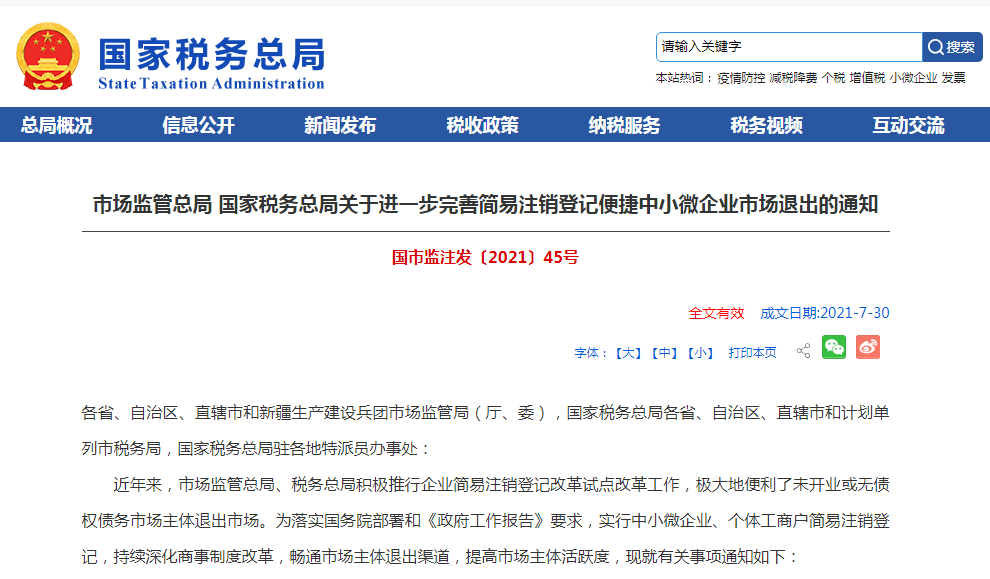 7月30日,稅務(wù)總局和國家市場監(jiān)督管理總局發(fā)布《關(guān)于進一步完善簡易注銷
